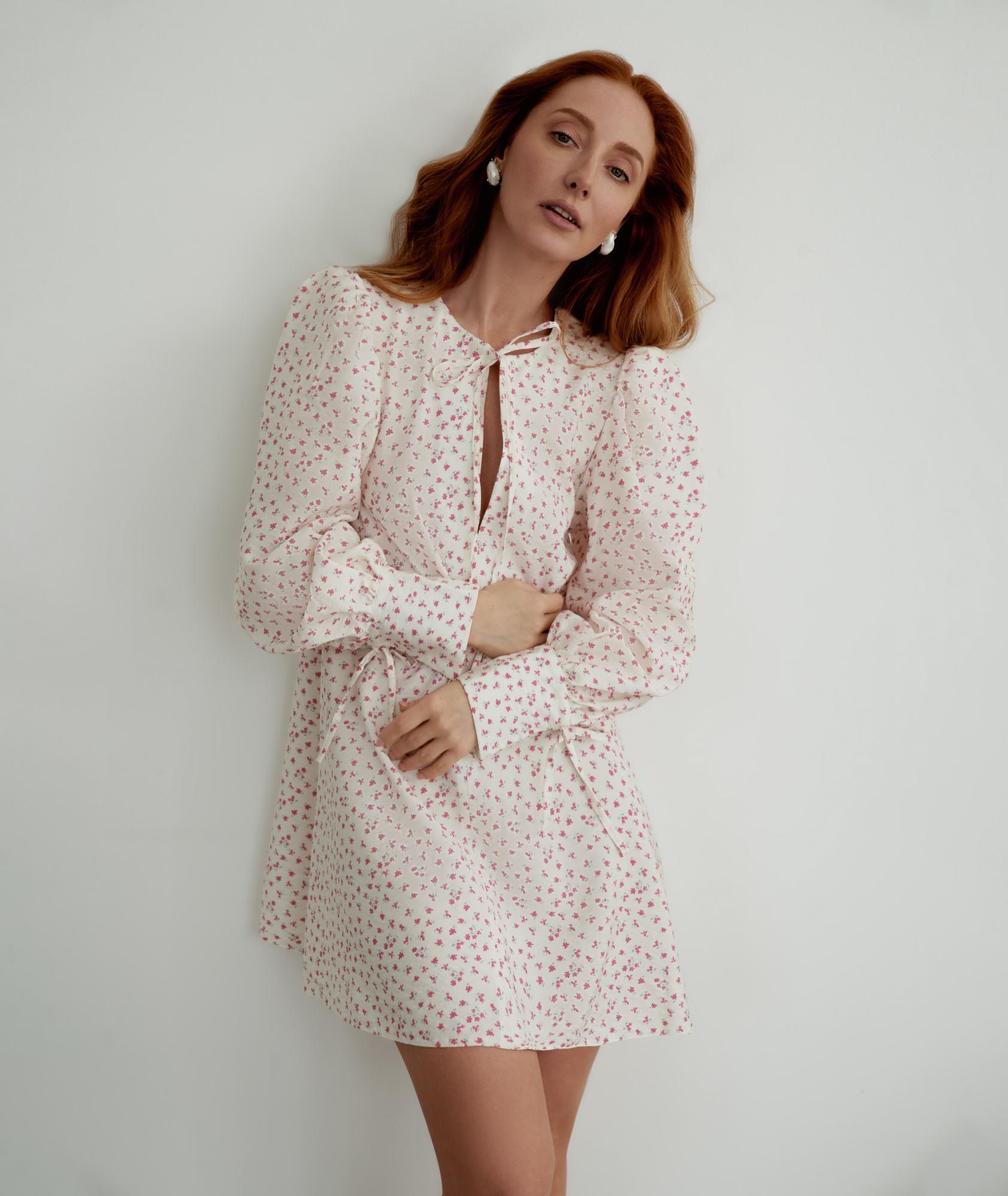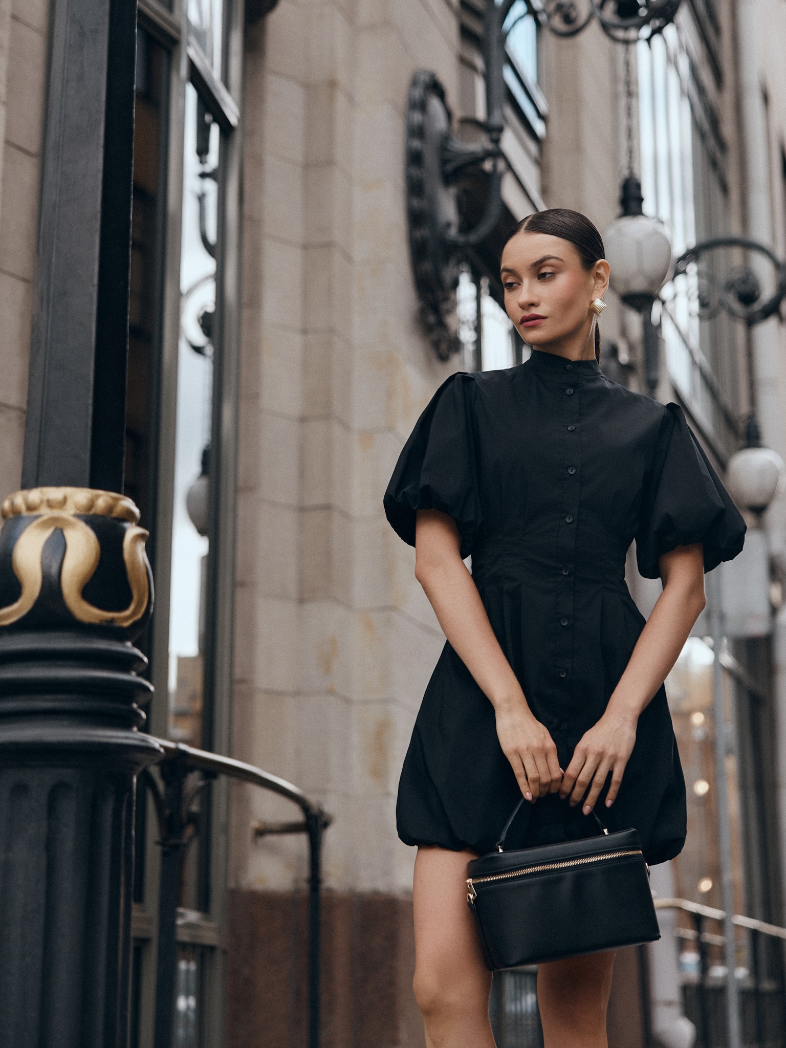 Приталенное платье мини с объемными рукавами и юбкой :: LICHI